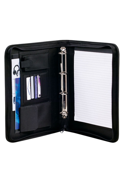 Borsa portadocumenti con manico e chiusura con zip.  Composta da: scomparto cellulare, portatessere, taschino portaoggetti, block notes (20 fogli), tasche portadocumenti, anelli con clip con meccanismo per raccoglitori. Poliestere / Microfibra.