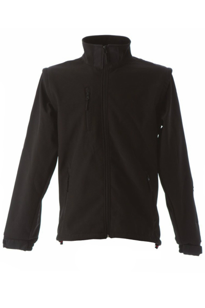 Giubbotto in soft shell impermeabile e traspirante, maniche staccabili, una tasca sul petto con zip, due tasche esterne con zip, una tasca con zip sul braccio, un taschino interno portacellulare, polsini con elastico regolabili con velcro, coulisse al fondo. 92% polyestere – 8% elastan. Waterproof 6000mm/H2O