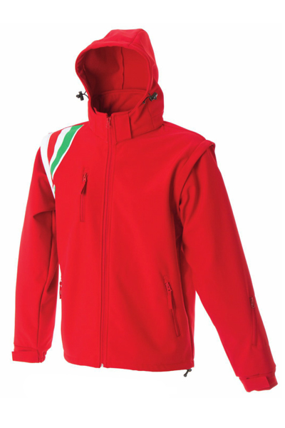 Giubbino in soft shell impermeabile e traspirante, maniche staccabili, una tasca sul petto con zip, fantasia tricolore sulla spalla, due tasche esterne con zip, una tasca con zip sul braccio, un taschino interno portacellulare, polsini con elastico regolabili con velcro, coulisse al fondo. 92% polyestere – 8% elastan. Waterproof 6000mm/H2O.