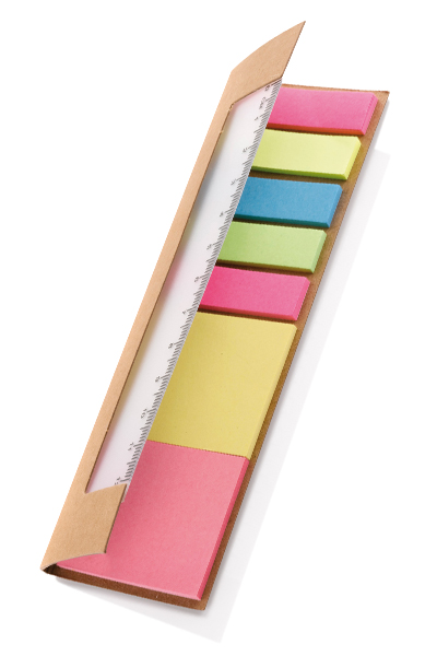 Portamemo da scrivania contenente righello e foglietti adeasivi di vari colori.