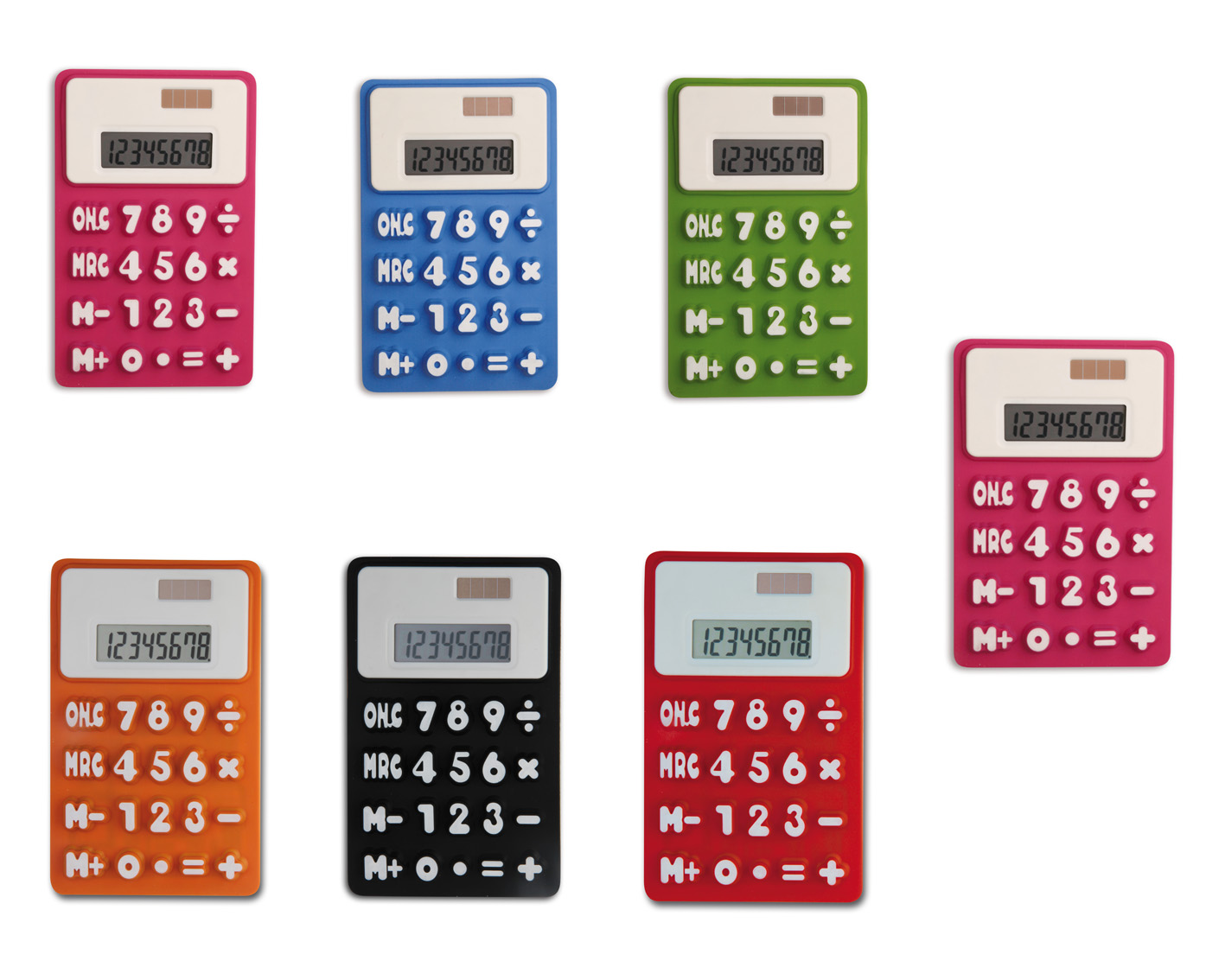 Calcolatrice 8 cifre in morbida gomma e con calamita sul retro. Doppia alimentazione.