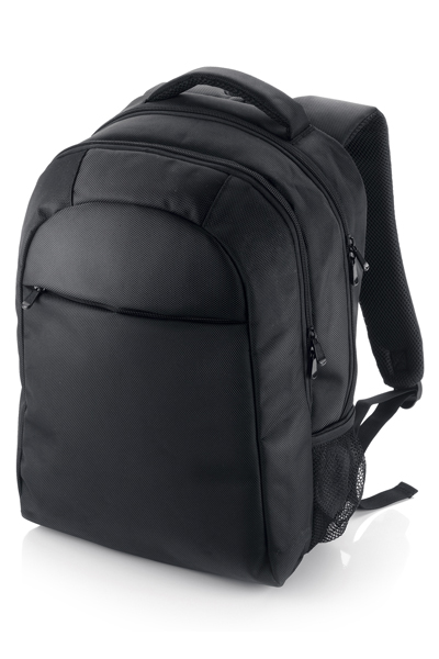 Zaino porta computer in tessuto 1680D. Comparto principale con alloggiamento imbottito per il laptop e organizer, tasca frontale con zip, tasca laterale in rete. Spallacci, schienale e maniglia imbottiti con materiale ergonomico e traspirante, tira zip in metallo.