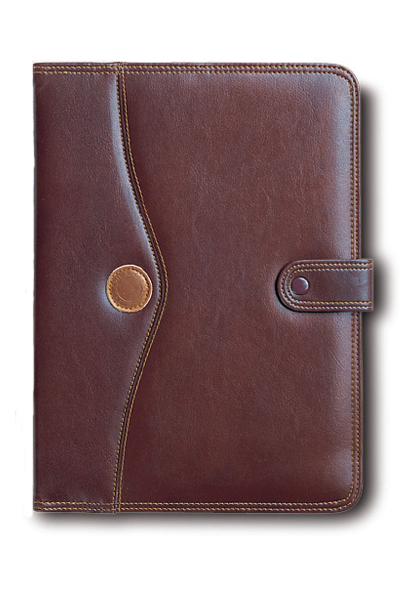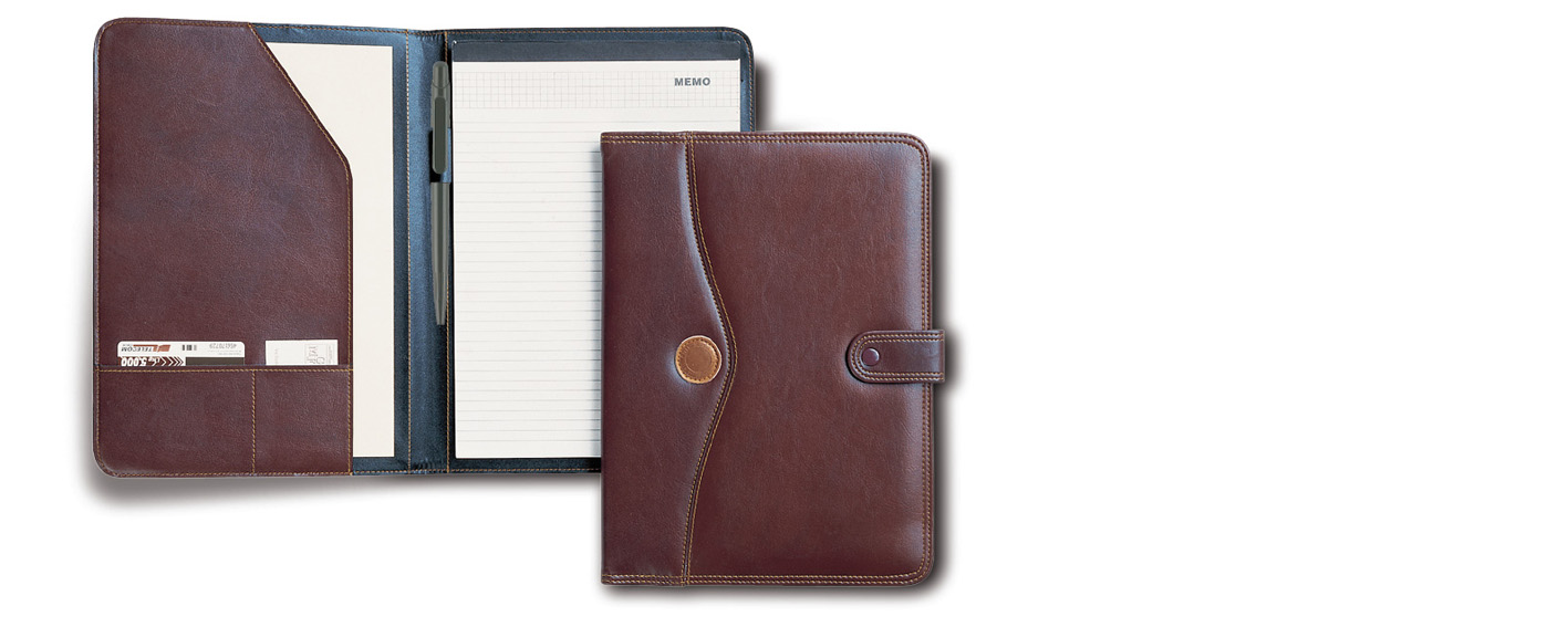 Cartella portablocco in formato A4 con blocco appunti, penna in plastica e tasche portabiglietti. Chiusura con bottone. cm 23 x 31,5 x 2